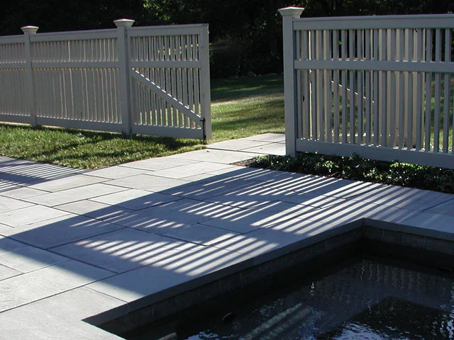 Because of its color, we chose full-color, natural cleft bluestone for the pool deck restoration. We used a random pattern and cut the edges in sweeping curves to match the curves of the pool. A six-inch border of rounded brownstone was installed along the pool and terrace wall to soften these interfaces.