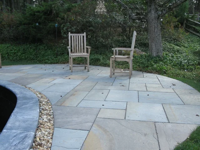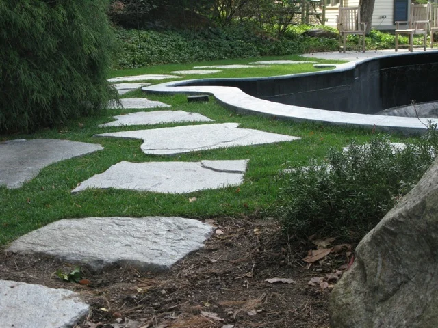 Large, sparkling Old Chester granite stepping stones set into sod connect the two patios and complete the perimeter around the pool.