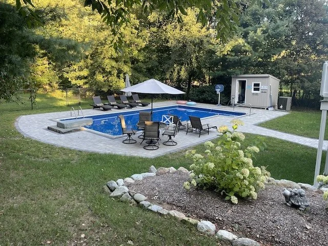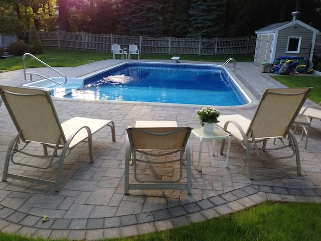 The pool deck design incorporated a double border on the outside perimeter with curves to deliver the needed room for lounging. The circle kit highlights the diving board (which are now scarce, unfortunately). The pool skimmer disappears under a removable paver that becomes part of the inner boarder.
