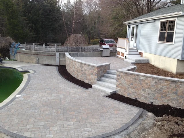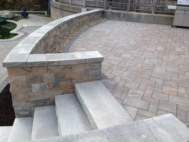 This two-tiered pool deck design included a curved retaining wall, curving granite steps plus an upper set of steps from the house. A curving trench drain is hidden under the decorative stones behind the retaining wall. It is important not to allow water buildup behind walls.