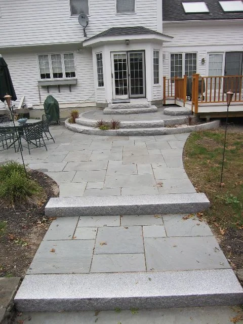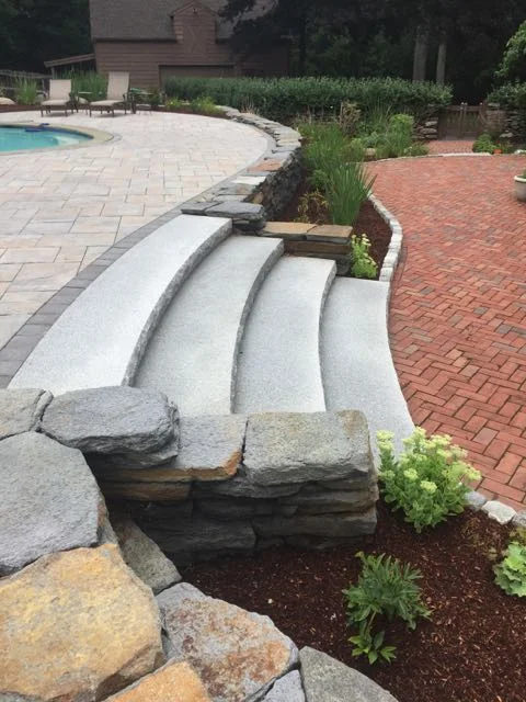 A failing brick wall was replaced by a dry laid Goshen stone wall with large, curving granite steps. The curve of the steps continued the curve of the wall. The paver pool deck replaced badly laid bluestone that was unbearably hot on the feet. The deck design built upon the curving pool outline and incorporated two paver circles.