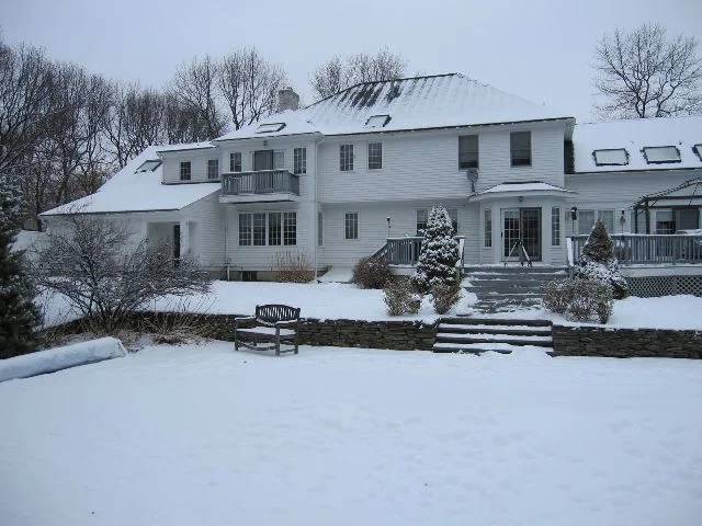 Although we do not install swimming pools, we can certainly help to make them special with a fine deck around the pool. This new 42'x20' pool with a 7'x7' spa is surrounded by 1200 square feet of random pattern bluestone. The 14" wide coping around both the pool and spa is also bluestone. We hid the pool skimmers underneath smaller pieces of bluestone and installed a large galvanized carriage bolt as the retractable handle.