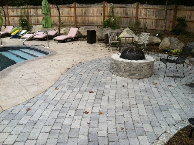 Gently flowing pavers with embedded fire pit meet stamped concrete